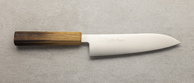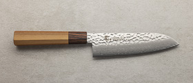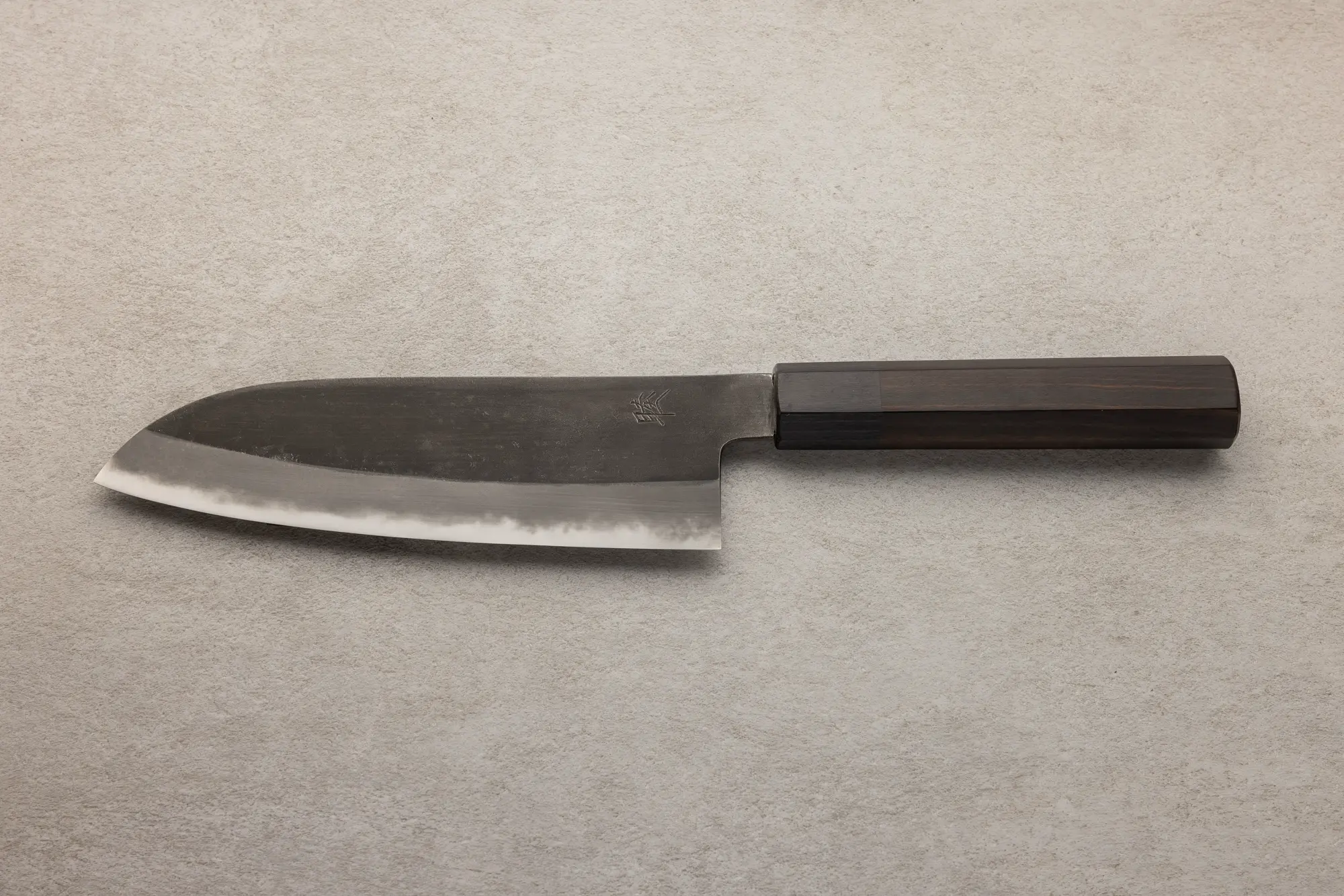 SANTOKU – v japonščini pomeni pomeni ” nož treh vrlin” Vsestranski kuhinjski nož, ki se uporablja za pripravo mesa, zelenjave in rib. Dolžina rezila: 165–180 mm. Nož ima bolj raven trebuh rezila kot povprečen zahodni kuhinjski nož, kar je prednost pri pripravi zelenjave s tehniko sekljanja naprej in navzdol. Širši profil rezila zagotavlja stabilnost in omogoča enostaven prenos sestavin s kuhinjske deske. Rahla ukrivljenost profila proti konici daje značilno sheepsfoot obliko, navzdol zaobljena konica rezila pa je idealna za natančno delo in kompleksne reze. Kljub ukrivljeni konici je ohranjen raven trebuh rezila, kar omogoča učinkovito sekljanje. Zaradi uporabniku prijazne oblike rezila in izjemne vsestranskosti je santoku odlična izbira tako za profesionalne kot tudi domače kuharje. Še posebej priljubljen je med ljubitelji azijskih kulinaričnih tehnik in jedi, ki zahtevajo veliko drobnega sekljanja zelenjave. Kljub temu je ta oblika že dolgo doma tudi v zahodnih kuhinjah, kar potrjuje njeno praktičnost in učinkovitost. Krajša dolžina santoku noža je idealna za manjše sodobne kuhinje, kjer ni prostora za večje rezalne deske, potrebne pri uporabi daljših nožev. Njegova lahkotnost je primerna za ljudi z manjšimi rokami in za začetnike, ki se pri daljših rezilih morda ne počutijo povsem samozavestno. Udobna dolžina omogoča odličen nadzor in ravnovesje med rezilom in ročajem, kar poskrbi za prijetno in varno izkušnjo rezanja.