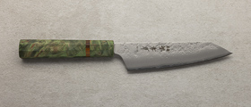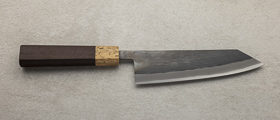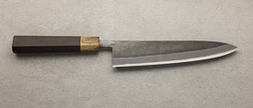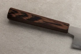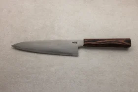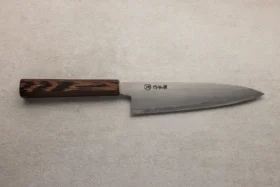 Shirogami, znano tudi kot White Steel, je vrhunsko ogljikovo jeklo, ki velja za eno najboljših izbir za tradicionalne japonske nože. Ime Shirogami v japonščini pomeni »beli papir« in izhaja iz preproste, bele embalaže, v katero proizvajalec Hitachi Metals zavija to jeklo. Osnova Shirogami jekla je izredno čisto ogljikovo jeklo brez dodatnih zlitin, kar omogoča izjemno ostrino in lahkotno brušenje. Zaradi svoje čistosti in visoke vsebnosti ogljika rezila iz Shirogami jekla razvijejo izjemno oster rob, vendar jeklo zahteva redno in skrbno vzdrževanje, saj je zaradi svoje narave bolj občutljivo na rjavenje in obrabo. Shirogami #2 je prav tako tradicionalno japonsko ogljikovo jeklo, ki vsebuje nekoliko manj ogljika kot Shirogami #1. Zaradi tega dosega trdoto okoli 63-64 HRC, kar mu daje večjo žilavost in manjšo dovzetnost za krušenje. Čeprav ne doseže enake obstojnosti ostrine kot Shirogami #1, ostaja zelo ostro in se enostavneje brusi, zato je primerno tudi za tiste, ki šele vstopajo v svet ogljikovih jekel. Shirogami #2 predstavlja odlično ravnovesje med ostrino, enostavnostjo brušenja in vzdržljivostjo, zato je priljubljena izbira tako med domačimi kot profesionalnimi kuharji.