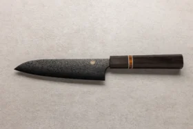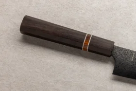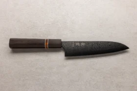 SANTOKU – v japonščini pomeni pomeni ” nož treh vrlin” Vsestranski kuhinjski nož, ki se uporablja za pripravo mesa, zelenjave in rib. Dolžina rezila: 165–180 mm. Nož ima bolj raven trebuh rezila kot povprečen zahodni kuhinjski nož, kar je prednost pri pripravi zelenjave s tehniko sekljanja naprej in navzdol. Širši profil rezila zagotavlja stabilnost in omogoča enostaven prenos sestavin s kuhinjske deske. Rahla ukrivljenost profila proti konici daje značilno sheepsfoot obliko, navzdol zaobljena konica rezila pa je idealna za natančno delo in kompleksne reze. Kljub ukrivljeni konici je ohranjen raven trebuh rezila, kar omogoča učinkovito sekljanje. Zaradi uporabniku prijazne oblike rezila in izjemne vsestranskosti je santoku odlična izbira tako za profesionalne kot tudi domače kuharje. Še posebej priljubljen je med ljubitelji azijskih kulinaričnih tehnik in jedi, ki zahtevajo veliko drobnega sekljanja zelenjave. Kljub temu je ta oblika že dolgo doma tudi v zahodnih kuhinjah, kar potrjuje njeno praktičnost in učinkovitost. Krajša dolžina santoku noža je idealna za manjše sodobne kuhinje, kjer ni prostora za večje rezalne deske, potrebne pri uporabi daljših nožev. Njegova lahkotnost je primerna za ljudi z manjšimi rokami in za začetnike, ki se pri daljših rezilih morda ne počutijo povsem samozavestno. Udobna dolžina omogoča odličen nadzor in ravnovesje med rezilom in ročajem, kar poskrbi za prijetno in varno izkušnjo rezanja.