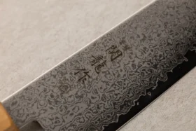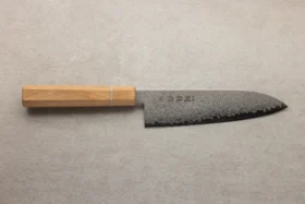 SANTOKU – v japonščini pomeni pomeni ” nož treh vrlin” Vsestranski kuhinjski nož, ki se uporablja za pripravo mesa, zelenjave in rib. Dolžina rezila: 165–180 mm. Nož ima bolj raven trebuh rezila kot povprečen zahodni kuhinjski nož, kar je prednost pri pripravi zelenjave s tehniko sekljanja naprej in navzdol. Širši profil rezila zagotavlja stabilnost in omogoča enostaven prenos sestavin s kuhinjske deske. Rahla ukrivljenost profila proti konici daje značilno sheepsfoot obliko, navzdol zaobljena konica rezila pa je idealna za natančno delo in kompleksne reze. Kljub ukrivljeni konici je ohranjen raven trebuh rezila, kar omogoča učinkovito sekljanje. Zaradi uporabniku prijazne oblike rezila in izjemne vsestranskosti je santoku odlična izbira tako za profesionalne kot tudi domače kuharje. Še posebej priljubljen je med ljubitelji azijskih kulinaričnih tehnik in jedi, ki zahtevajo veliko drobnega sekljanja zelenjave. Kljub temu je ta oblika že dolgo doma tudi v zahodnih kuhinjah, kar potrjuje njeno praktičnost in učinkovitost. Krajša dolžina santoku noža je idealna za manjše sodobne kuhinje, kjer ni prostora za večje rezalne deske, potrebne pri uporabi daljših nožev. Njegova lahkotnost je primerna za ljudi z manjšimi rokami in za začetnike, ki se pri daljših rezilih morda ne počutijo povsem samozavestno. Udobna dolžina omogoča odličen nadzor in ravnovesje med rezilom in ročajem, kar poskrbi za prijetno in varno izkušnjo rezanja.