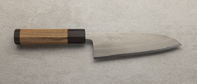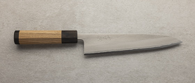 Yoshikane Hamono je ena najbolj cenjenih tradicionalnih nožarskih delavnic na Japonskem, ustanovljena leta 1919 v mestu Sanjo, prefektura Niigata, ki slovi po vrhunskem kovaštvu. Gre za družinsko podjetje z več kot 100-letno tradicijo, danes pod vodstvom generacije Tsunehiro Yamamoto, ki nadaljuje izjemno dediščino ročne izdelave kuhinjskih nožev. Yoshikane noži slovijo po vrhunski obdelavi, odličnem ravnovesju in natančno kontrolirani geometriji rezil. Najpogosteje uporabljajo jekla kot so SKD-12 (semi-stainless tool steel), White #2 in Shirogami ter vrhunsko Aogami Super. Noži so pogosto izdelani v san-mai konstrukciji (trda sredica obdana z mehkejšim jeklom), kar omogoča kombinacijo ostrine in trpežnosti. Yoshikane posebej izstopa po t.i. kuro-uchi in nashiji obdelavah površin, ki dajejo nožem rustikalni, a prefinjen videz. Vsak Yoshikane nož je ročno kaljen, brušen in zaključen z izjemno natančnostjo. Njihova rezila so tanka, a hkrati zelo stabilna – znani so po wide bevel grindu, kar pomeni, da so izjemno primerni za fino brušenje in ostrenje. Pogosto imajo tradicionalne wa ročaje iz orehovine, magnolije ali ebenovine z ročnimi zaključki. Yoshikane ni masovna znamka – njihova proizvodnja je majhna in osredotočena na kakovost, ne kvantiteto. Zato so njihovi noži zelo cenjeni med profesionalnimi kuharji in ljubitelji japonskih nožev, ki cenijo brezkompromisno ostrino, občutek v roki in estetsko dovršenost. Zaradi omejenih količin in dolge izdelave so pogosto težko dostopni, a to jim daje še večjo vrednost med poznavalci.